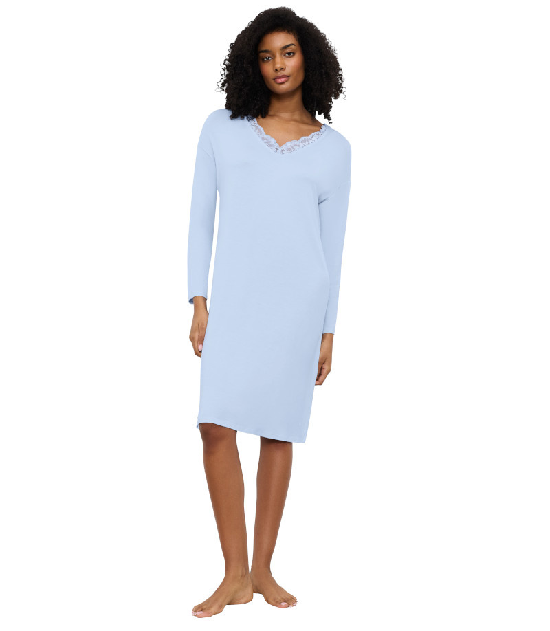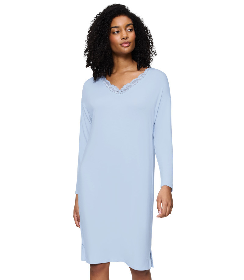 - Piękna koszula nocna z długimi rękawami doskonale dopasuje się do Twojej sylwetki. Efektowny, a zarazem wygodny dekolt w kształcie litery ozdobiony delikatną koronką. Praktyczna długość zapewnia komfort podczas noszenia.