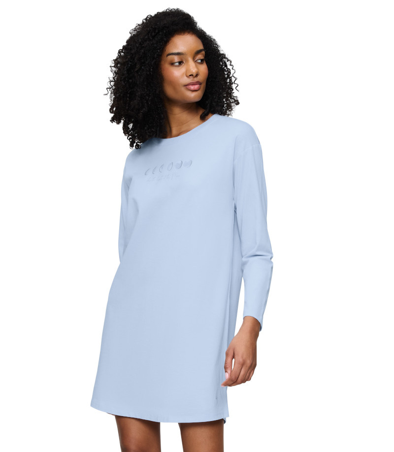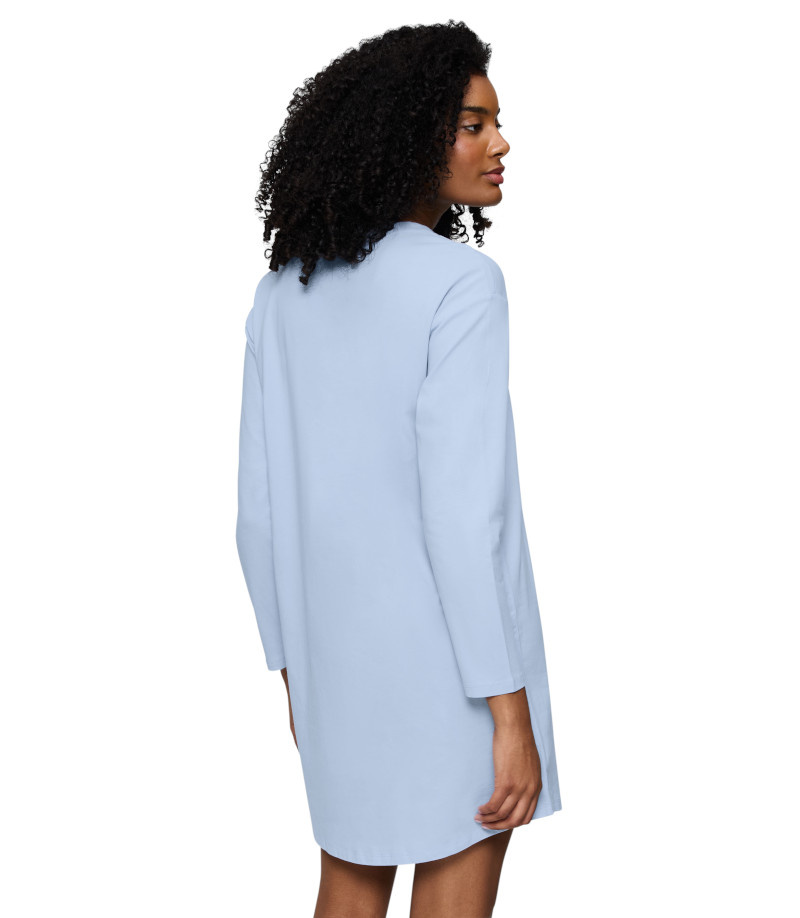 • Koszula nocna z długim rękawem wykonana z miękkiej certyfikowanej bawełny przyjemnie otula ciało i poprawia jakość snu. Modny fason w klasycznym kolorze ice blue dodaje atrakcyjności. Komfortowy dekolt wycięty na półokrągło.