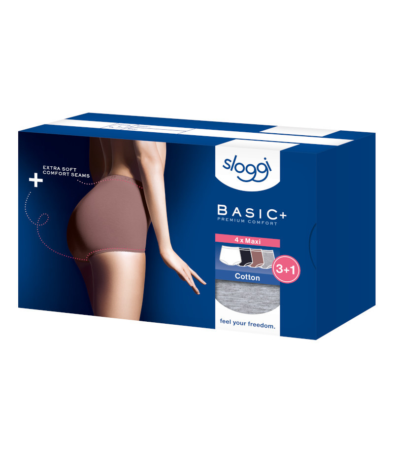- sloggi Basic+ Maxi 4P to majtki wykonane z najwyższej jakości, miękkiej i przyjemnej w dotyku bawełny. Dostępne w praktycznym czteropaku.