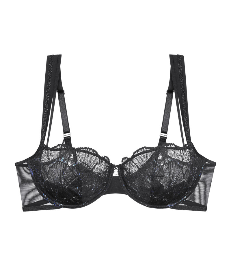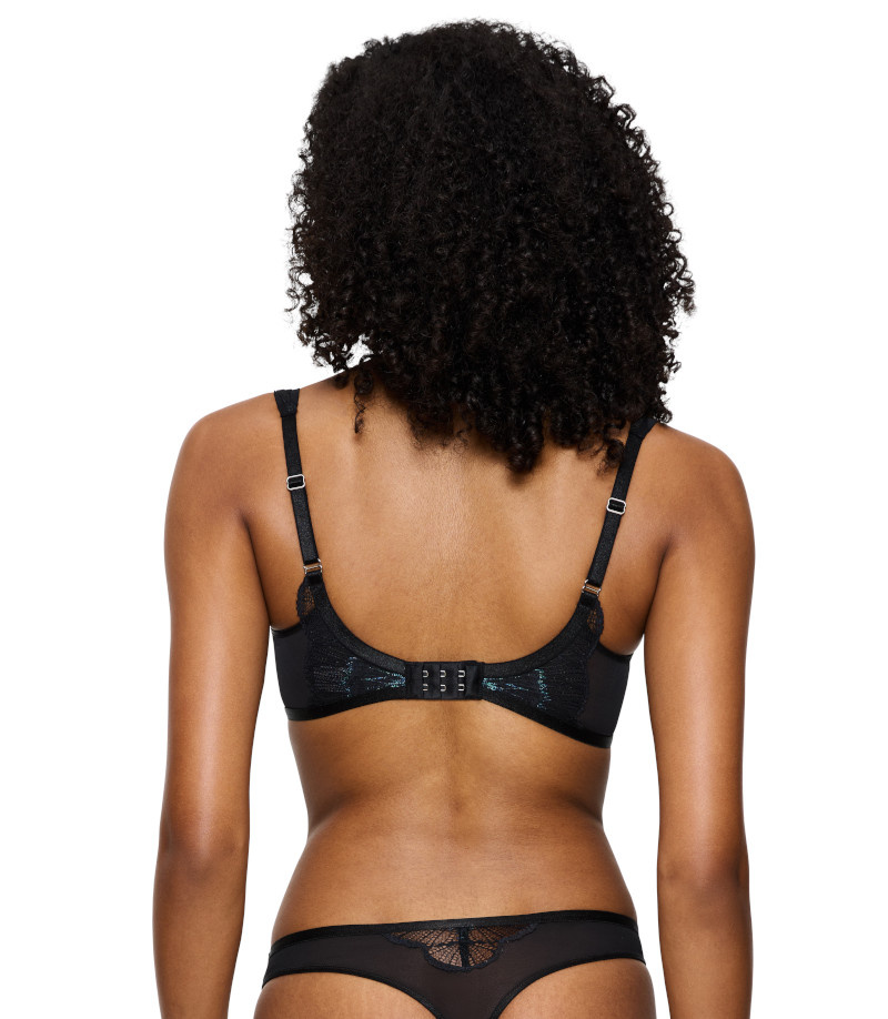 Luksusowa koronka łączy się z opalizującą nitką lureksową, dodając bieliźnie blasku. Efekt push-in i zaokrąglone wycięcie na plecach tworzą seksowny i zmysłowy wygląd.