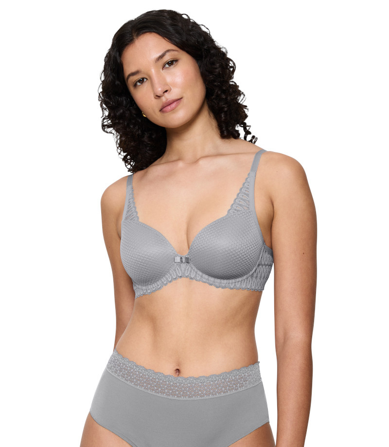 - Elegancki biustonosz z usztywnianymi miseczkami. Gładka tekstura zapewni Ci dyskrecję pod dopasowany outfit. Przyjemny w dotyku, oddychający materiał gwarantuje uczucie komfortu przez cały dzień.