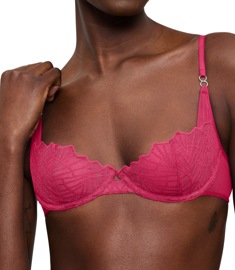 Balkonetka dla uwodzicielskiego wyglądu. Koronkowe miseczki i siatkowe wzmocnienia boczne tworzą efekt push-in. Graficzna koronka z przezroczystymi panelami z siateczki dodaje blasku każdej stylizacji.