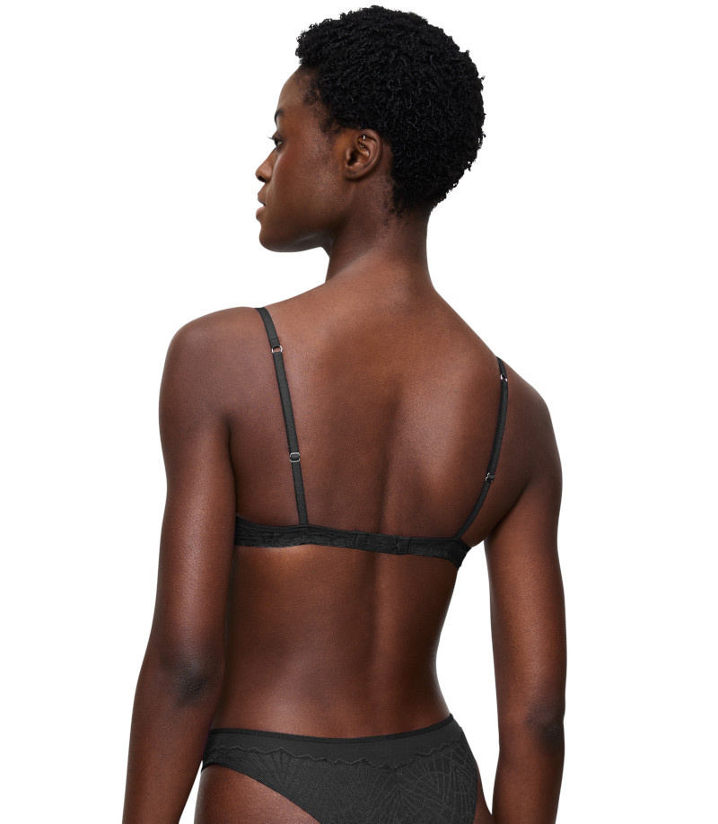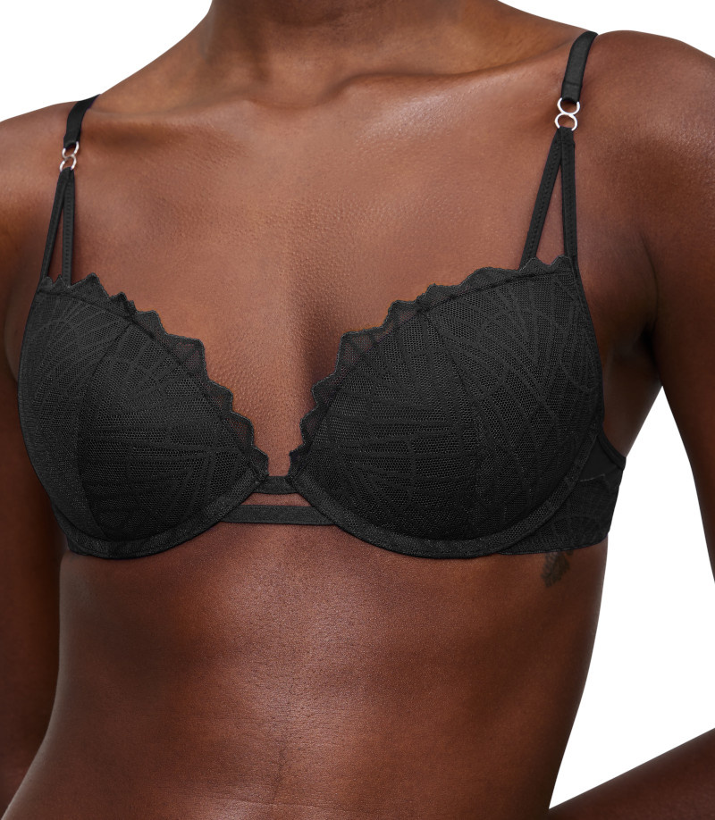Dekolt w stylu push-up i ultra lekkie miseczki. Biustonosz z graficzną koronką łączy funkcjonalność z seksownym wyglądem. Zaprojektowaliśmy go z myślą o odważnej i uwodzicielskiej sylwetce.