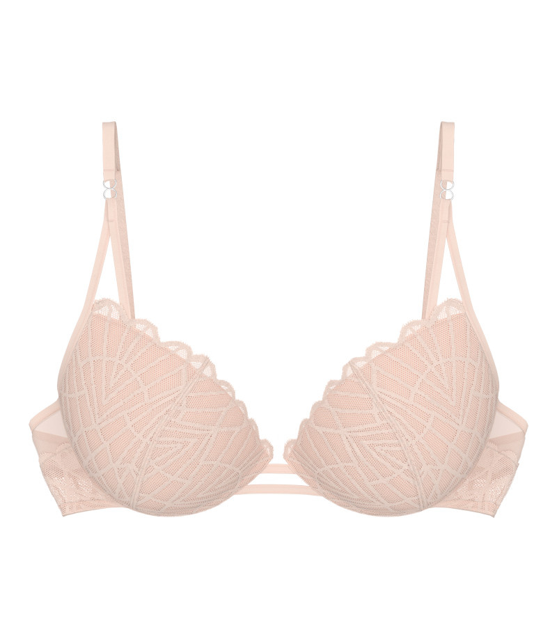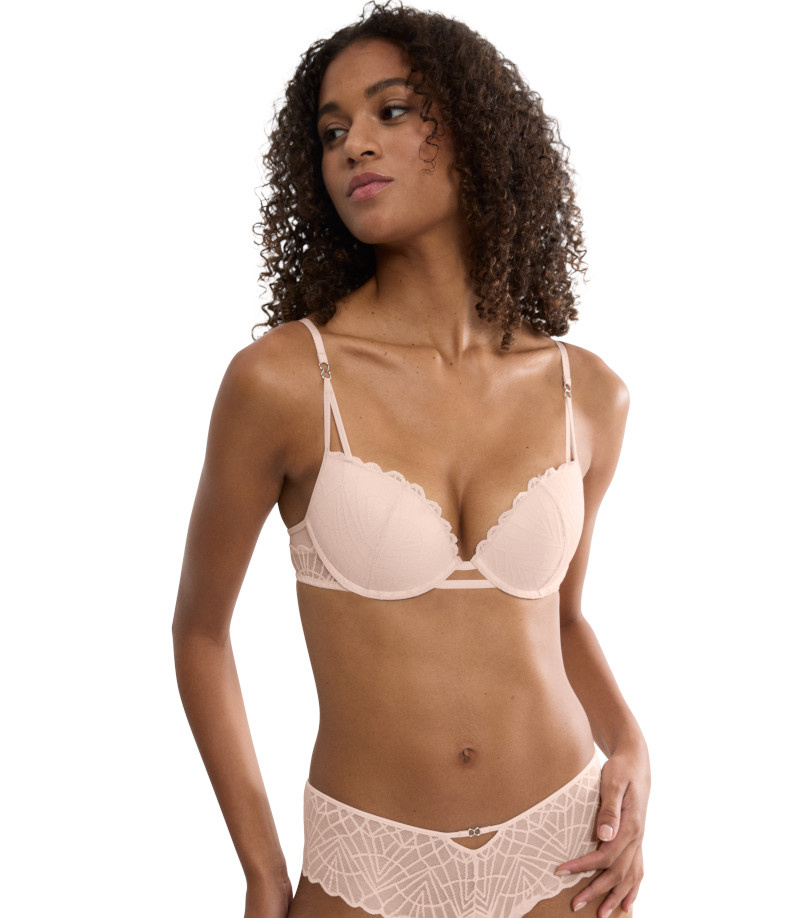 Dekolt w stylu push-up i ultra lekkie miseczki. Biustonosz z graficzną koronką łączy funkcjonalność z seksownym wyglądem. Zaprojektowaliśmy go z myślą o odważnej i uwodzicielskiej sylwetce.