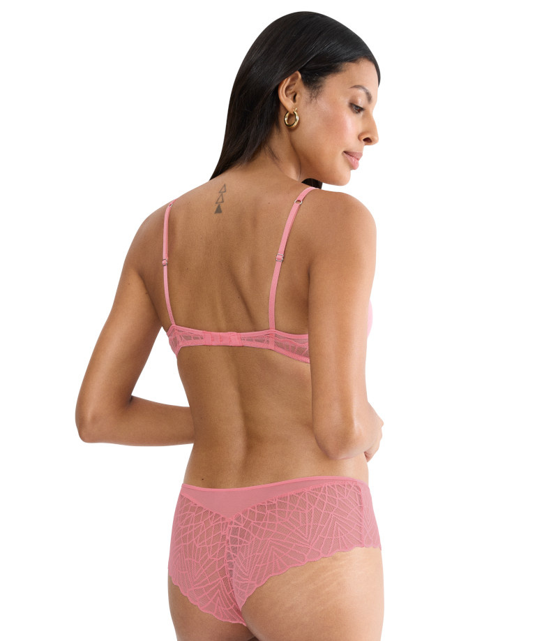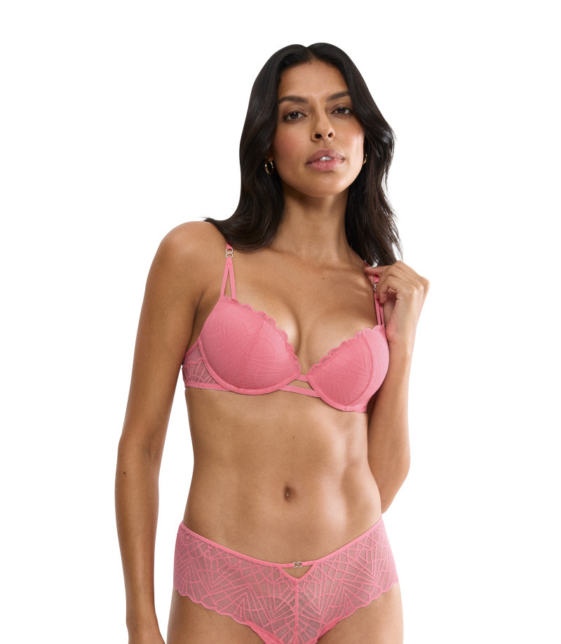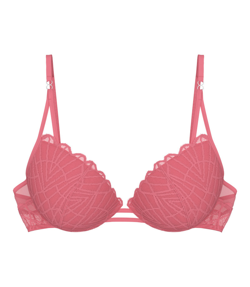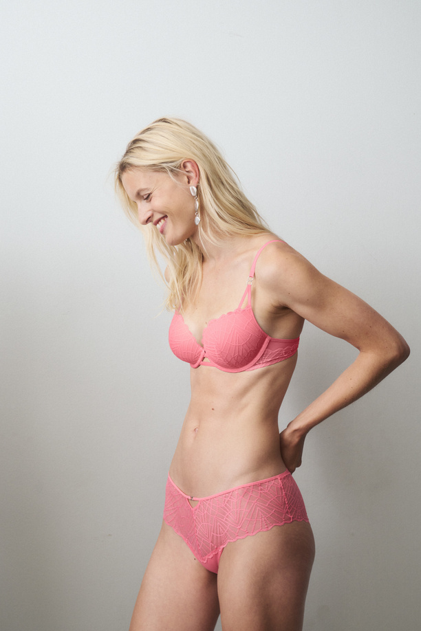 Dekolt w stylu push-up i ultra lekkie miseczki. Biustonosz z graficzną koronką łączy funkcjonalność z seksownym wyglądem. Zaprojektowaliśmy go z myślą o odważnej i uwodzicielskiej sylwetce.